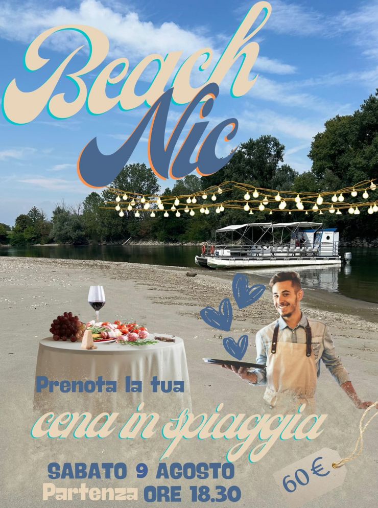 Si parte alle ore 18.30 al pontile di Pizzighettone per risalire il fiume Adda per circa 1 ora, nella splendida cornice del Parco Adda Sud in compagnia di aironi, garzette e cormorani, avvolti dall'atmosfera della sera. Si sbarca poi su una spiaggia di sabbia e ghiaia dove si potrà cenare. Durante il viaggio verrà servito un calice di benvenuto, la Cena e servita da La Vecchia Corte Oseteria, via xxv aprile, 6 Cavacurta di Castelgerundo (Lo).